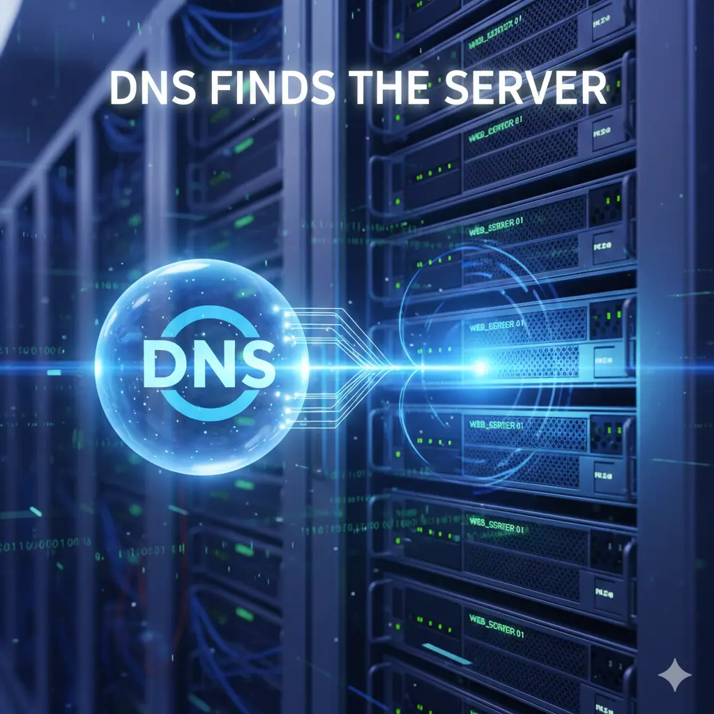 The browser contacts a system called DNS, which stands for Domain Name System. DNS acts like a phone book for the internet.